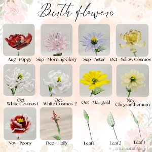Jan – Carnation, Jan – Snowdrop, Feb – Iris, Feb – Violet [Sold out], Mar – Jonquil, Apr – Sweat Pea, May – Lilly / Valley, May – Hawthorn, Jun – Honeysuckle, Jun – Rose, Jul – Water Lily, Aug – Gladiolus, Aug – Poppy, Sep – Morning Glory, Sep – Aster [Sold out], Oct – White Cosmos 1 [Sold out], Oct – White Cosmos 2, Oct – Yellow Cosmos, Oct – Marigold, Nov – Chrysanthemum, Nov – Peony [Sold out], Dec – Holly, Leaf 1, Leaf 2